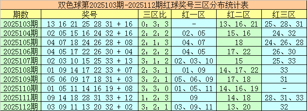 双色球第2025112期开出奖号为:03、09、11、13、20、32+02,其中红球三区比为3:2:1,蓝球开出偶数、小 号、2路号码。