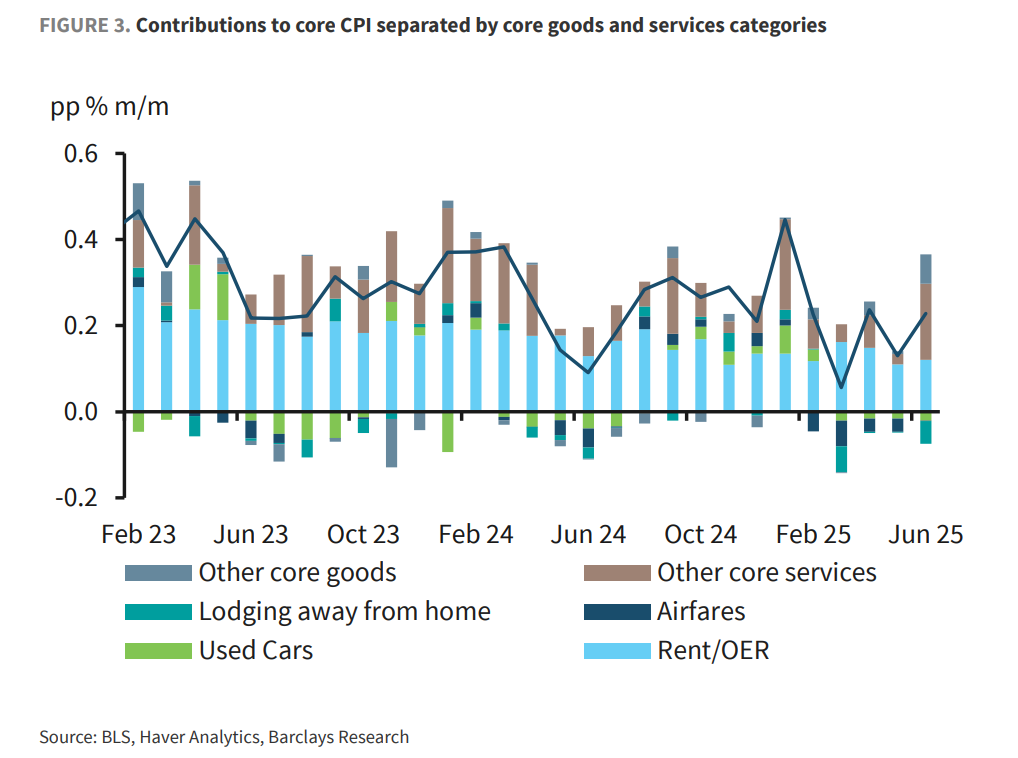 美银认为,6月CPI表面疲软掩盖结构性变化,期待已久的关税传导证据终于出现。核心商品(比如家电、衣服、娱乐用品等)价格6月上涨,是2月以来第一次涨。目前投行普遍预计,受股市反弹,投资相关的服务推高影响,美联储更看重的 “核心PCE”可能更“猛”。分析师强调,如果PCE数据强劲,美联储今年不降息的理由将会加强。
